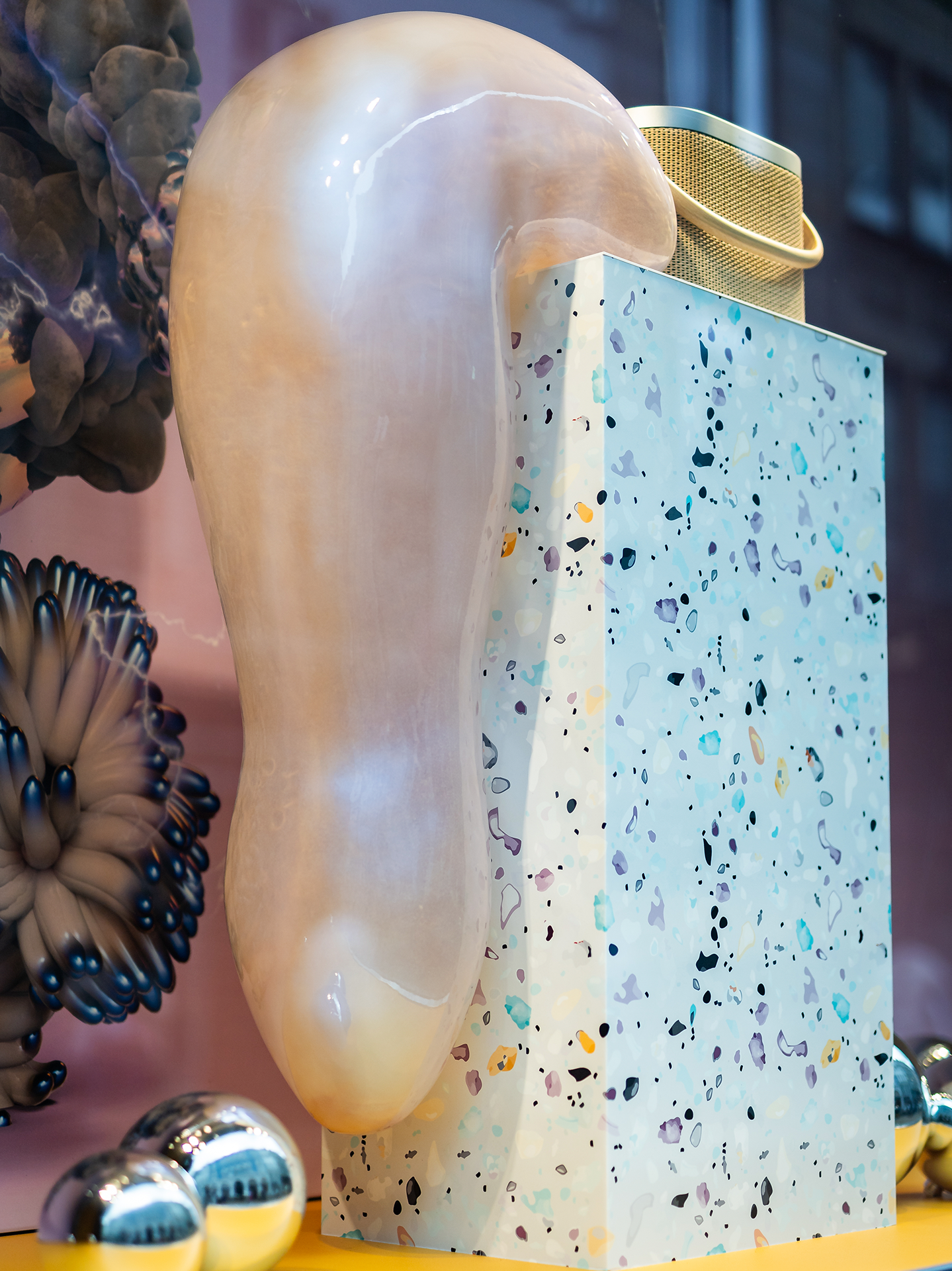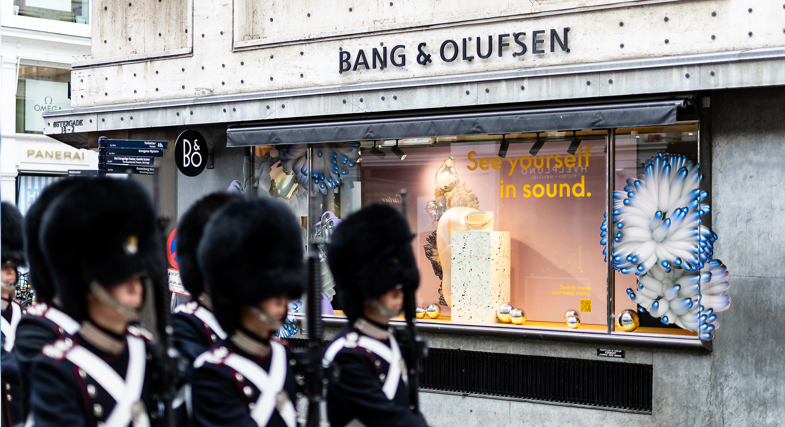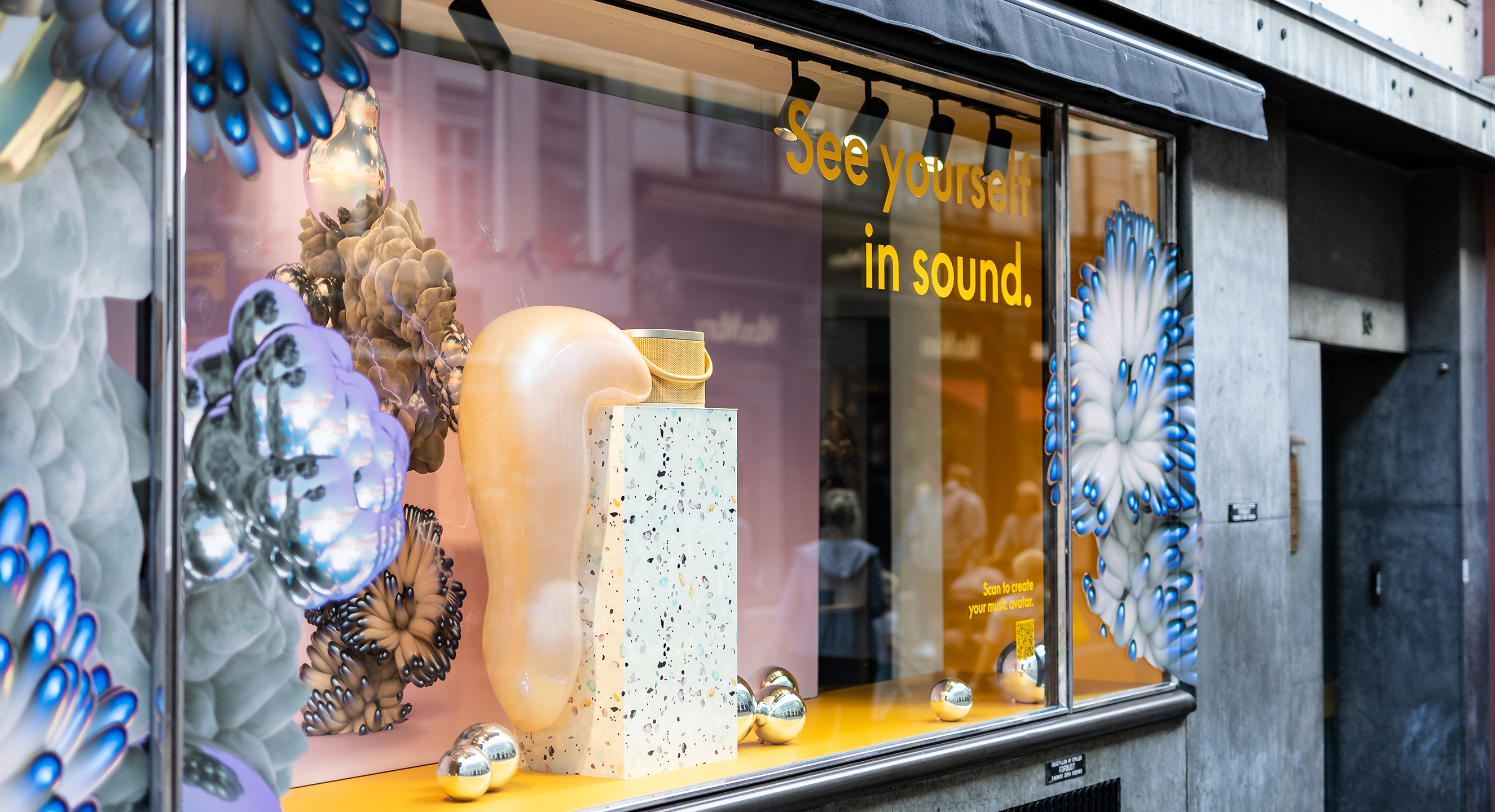 I samarbejde med Bang & Olufsen har vi skabt en bemærkelsesværdig vinduesudstilling, der ikke kun bryder med brandets klassiske stil, men også med vinduets begrænsninger. På udstillingspodiet materialiserer en avatar sig ud af en højtaler. Vinduets farver og former er designet til at fange de forbipasserendes blikke og lede dem mod butikken.