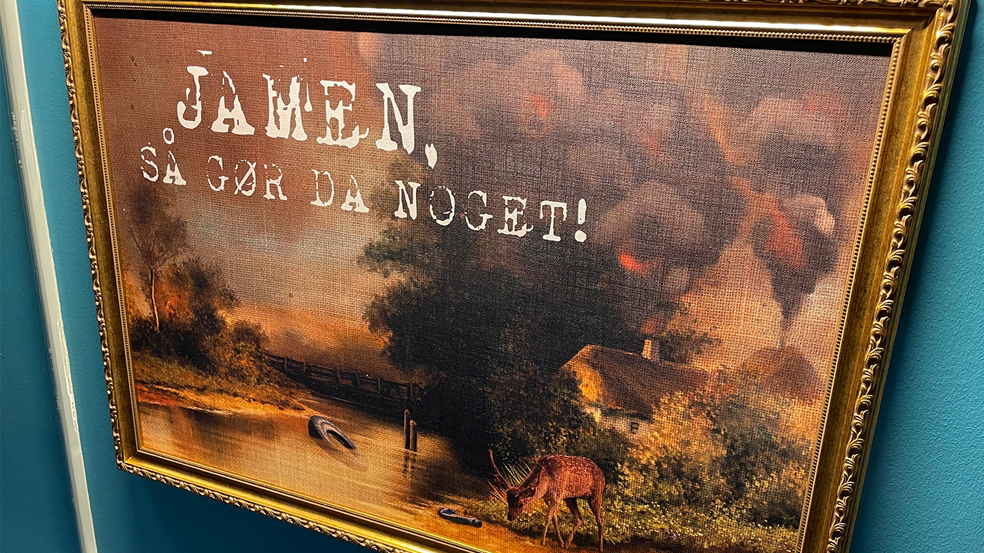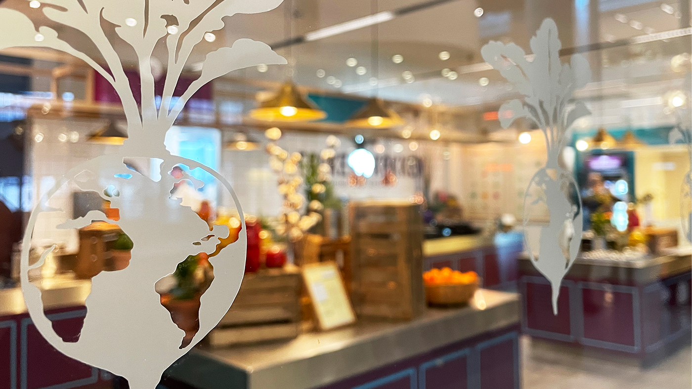– vores kreative afdeling har malet oven på det oprindelige motiv, som nu bærer præg af mørke og forurening. Maleriet er et opråb om, at vi sammen kan gøre en forskel for miljøet. Materialevalgene, på tværs af hele indretningen, er nøje udvalgt, så de skaber en stemning af liv og imødekommenhed. Eksempelvis bliver traditionelle, hvide vægklinker brudt op af klinker i varme nuancer, hvor den håndtegnede rødbede fra Folkekøkkens logo går igen.
