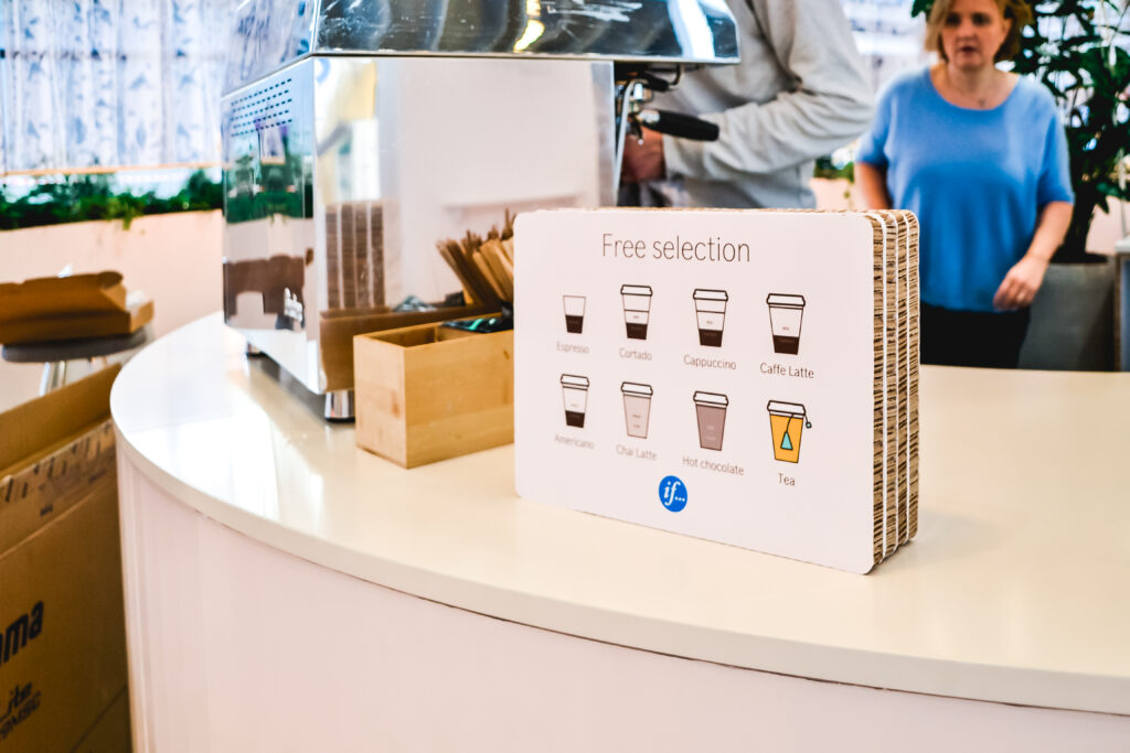 Der var mange forskellige elementer på messestanden, hvor størstedelen var lavet i miljøvenlig reboard. Affaldsspande, menukort og borde var alle fremstillet i vores reboard-løsning. Det gennemsigtige trico-stof var med til at indramme lounge-området, hvilket skabte en rolig atmosfære. Et rullende If logo, produceret i flamingo, gjorde det muligt for medarbejderne at have deres brand med på tur, og skabte blikfang rundt omkring på messen. En sjov gimmick.