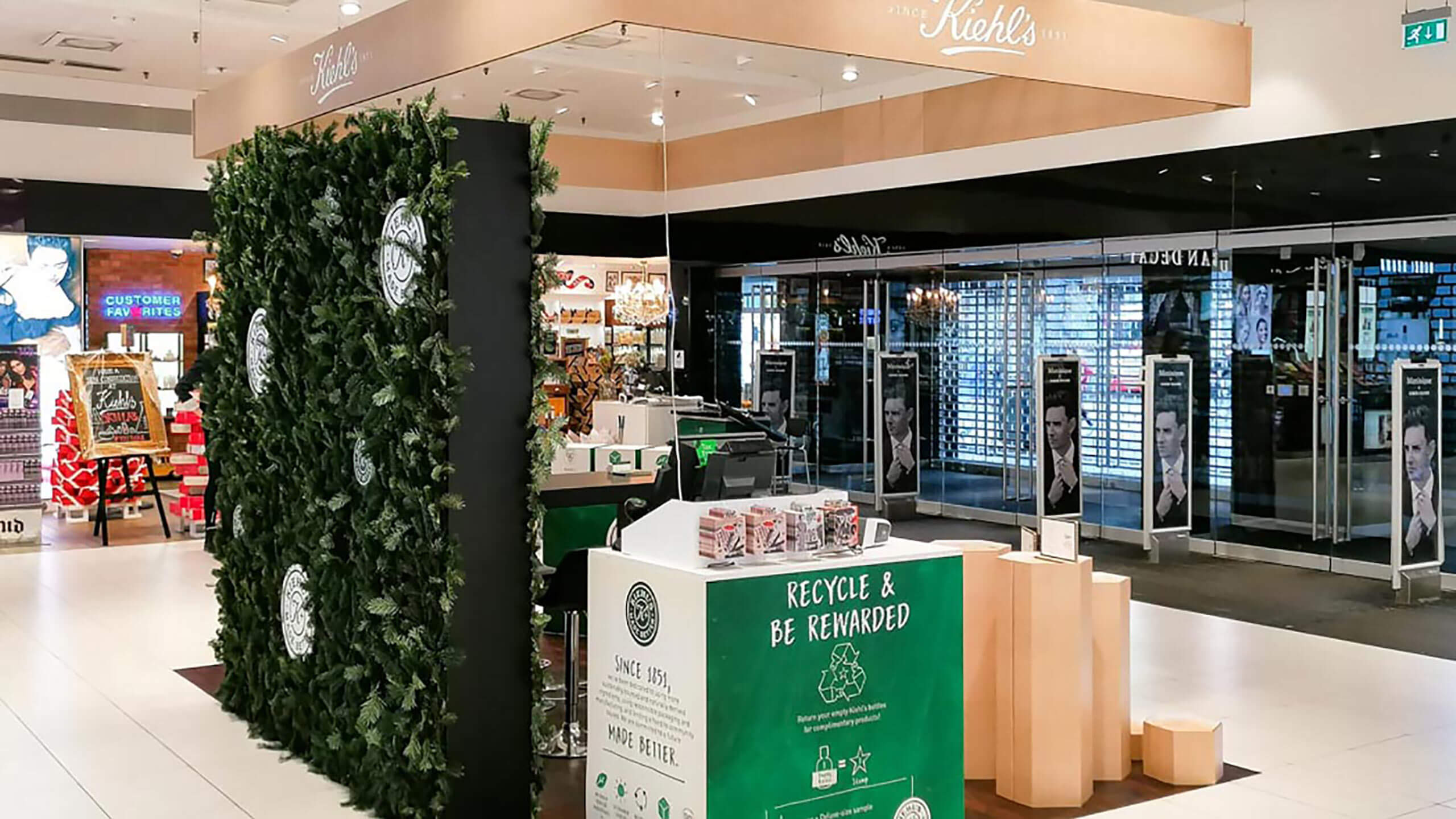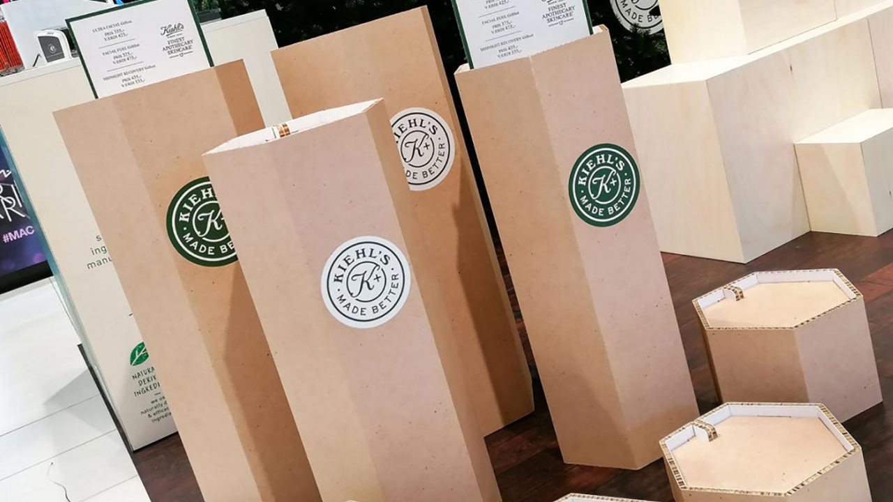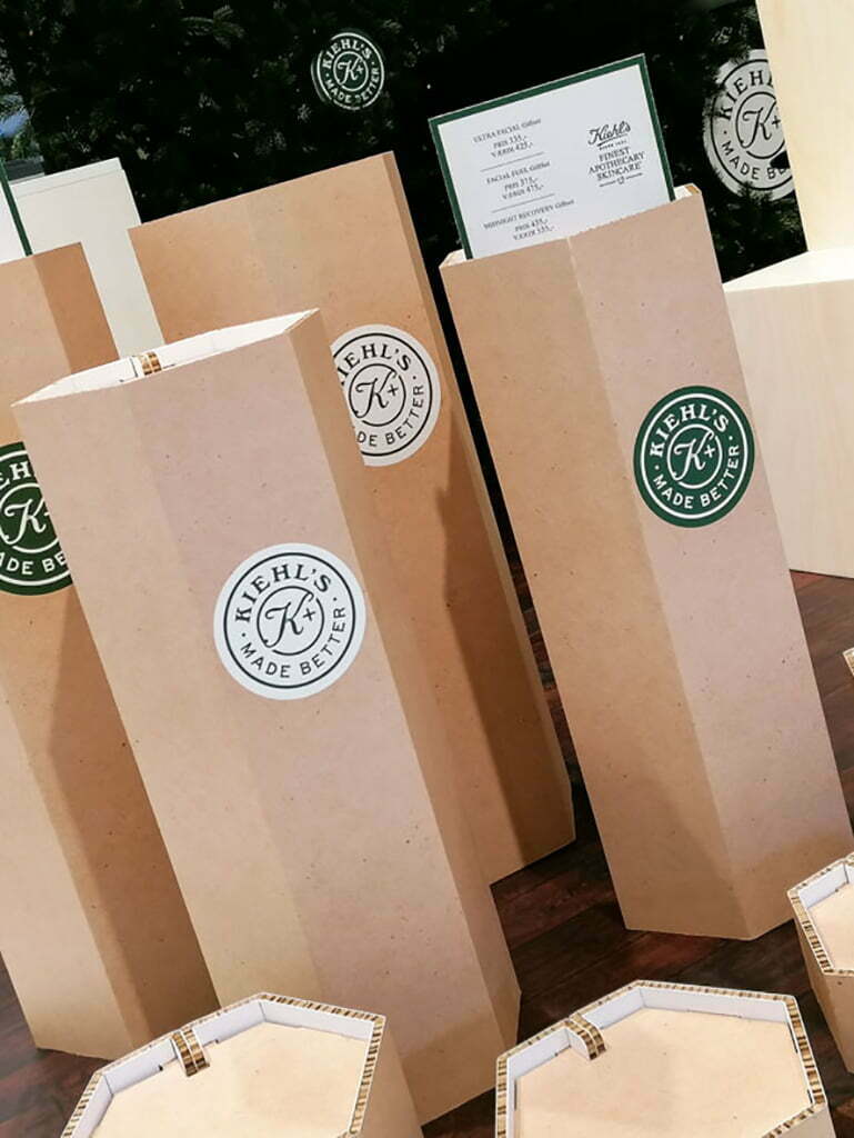 I tæt samarbejde med Kiehl’s since 1851’s Brand Manager blev resultatet en unik pop-up stand som både i form, kommunikation og visuelt udtryk taler sit helt eget recycle-sprog og tiltrækker nye kunder.